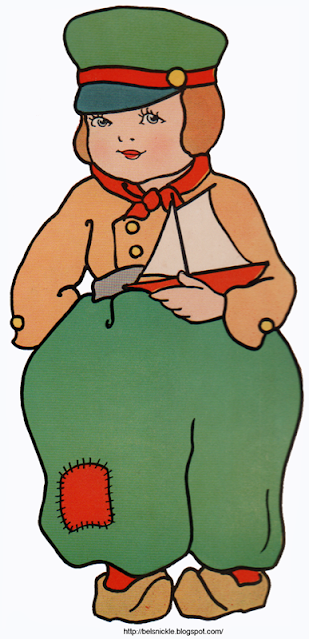 | Little Dutch cousin holds a wooden sailboat toy. He wears wooden clogs and has a patch on his pants |