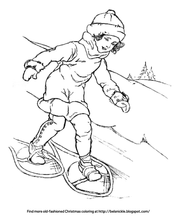Description of Coloring Page: snowshoes, snow shoes, winter fun, cold outside, child, little girl, downhill, winter sport, cap and mittens
